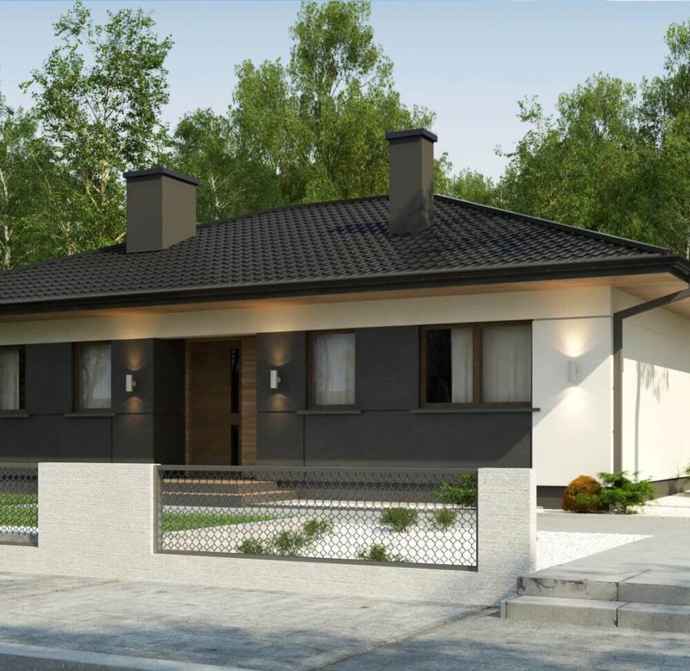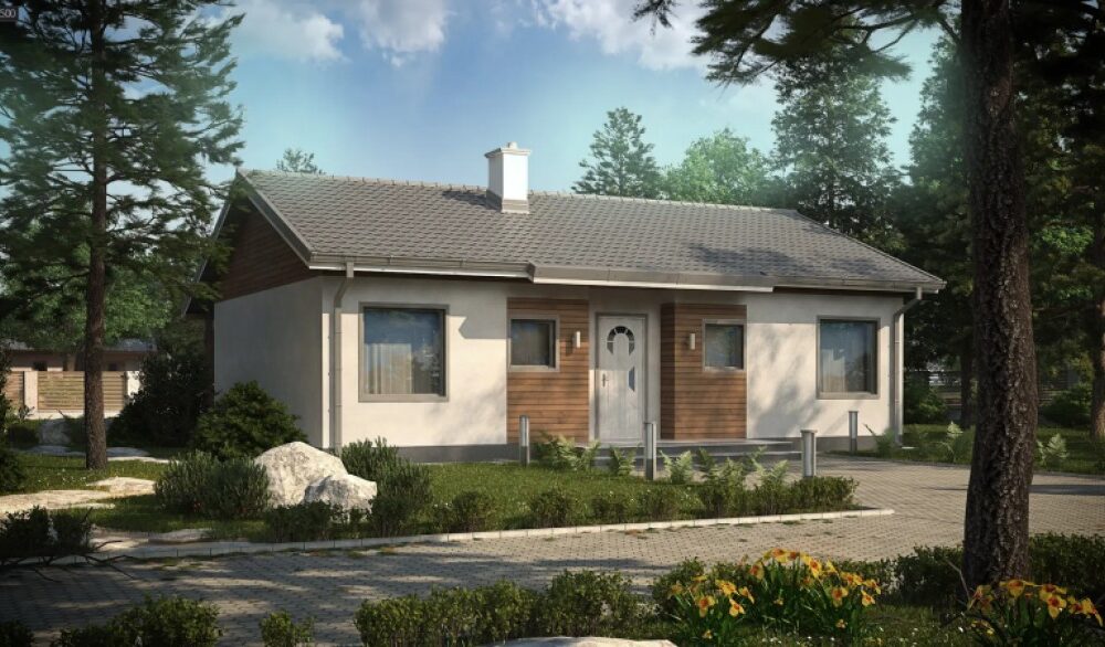 Ekonomiczny i funkcjonalny dom z dachem dwuspadowym, zaprojektowany z myślą o praktycznych rozwiązaniach.