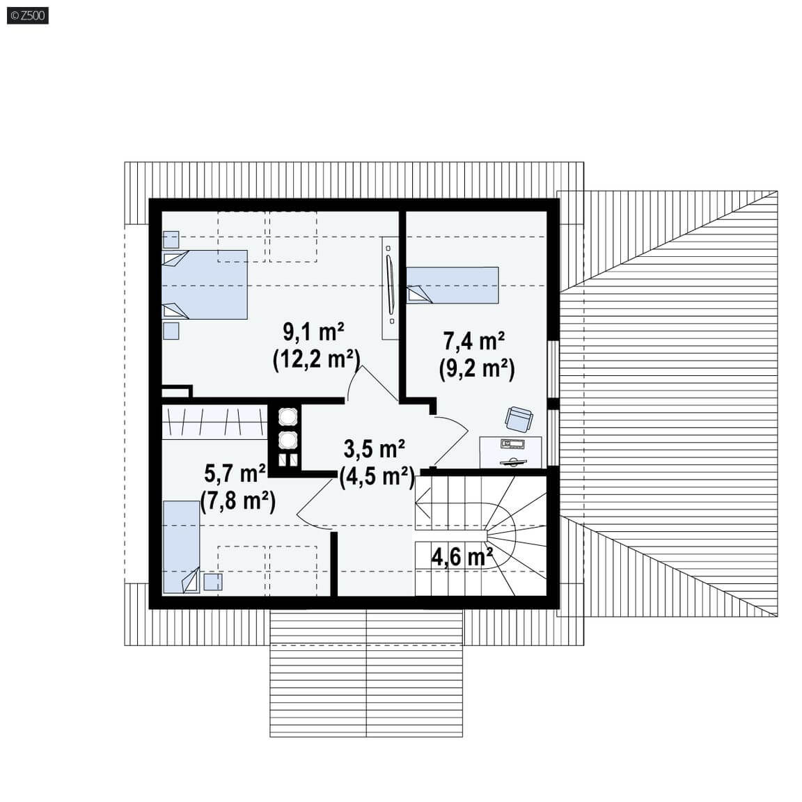 Poddasze przeznaczone jest do wypoczynku nocnego – są tu trzy pokoje z przeznaczeniem na sypialnie. Istnieje także możliwość przekształcenia najmniejszego pokoju na dodatkową łazienkę.