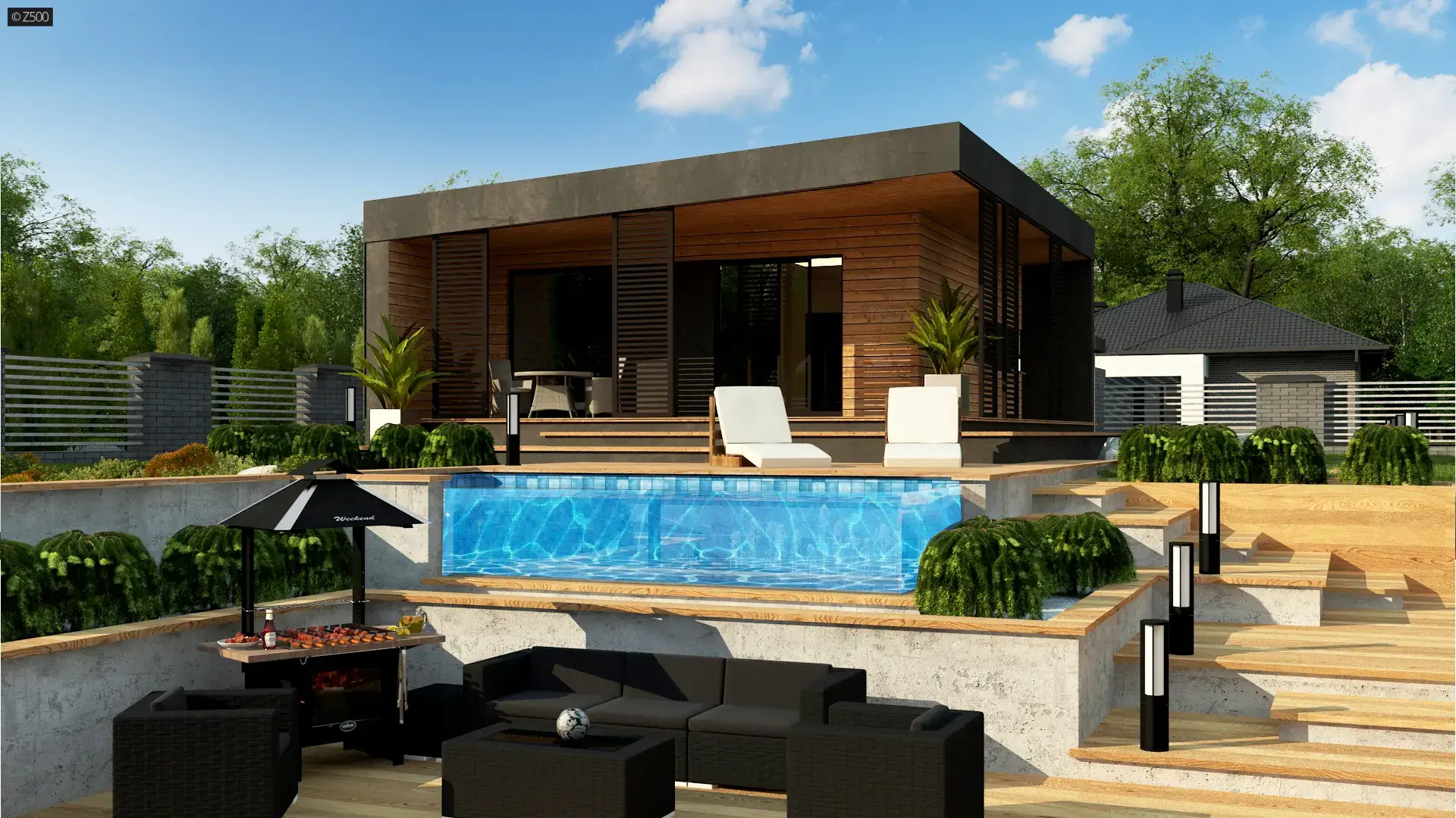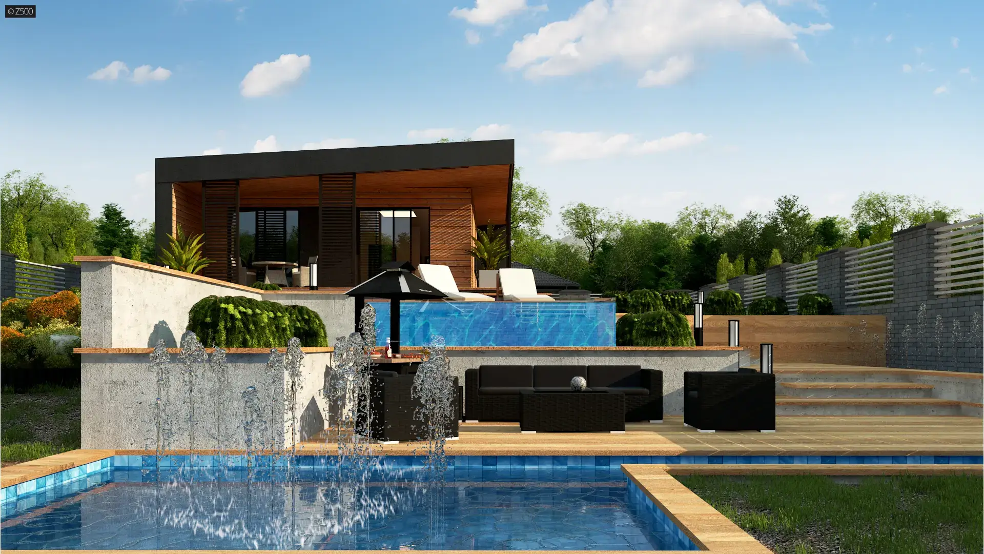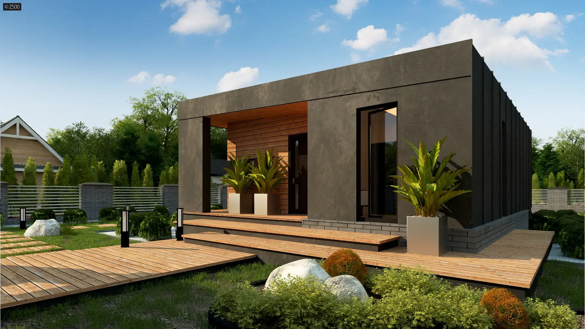 Zx157 D to propozycje niewielkiego, drewnianego, nowoczesnego domu w konstrukcji drewnianej. Elewację wykonano z drewna oraz ciemnego tynku. Duże, zadaszone tarasy biegnące z 3 stron pozwalają na przejście od strony ogrodu do domu bez zmoknięcia.